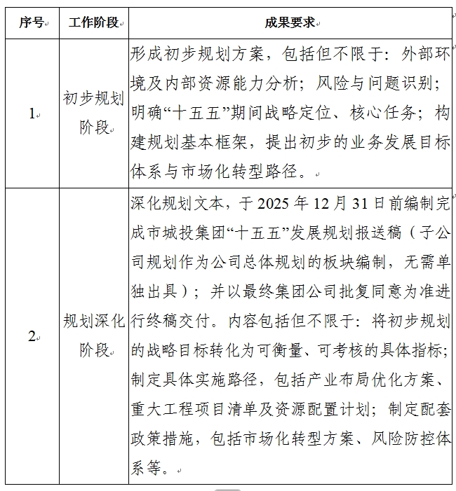 1.服務內容:本次采購旨在選取專業規劃咨詢服務單位,通過專業機構的深度謀劃,助力集團公司在“十五五”期間明確發展方向,優化資源配置,提升核心競爭力,為實現遠期戰略目標奠定堅實基礎。服務內容包括但不限于:外部環境及內部資源能力分析、企業發展規劃目標及業務布局、國企轉型措施、重大任務及保障措施、實施計劃、具體實施細則以及在“十五五”推進中進行中期和末期評估等方面。方案需在2025年9月20日前完成初稿,2025年12月31前完成報送稿,根據反饋意見在采購人要求的時間內完成修正稿(終稿)。